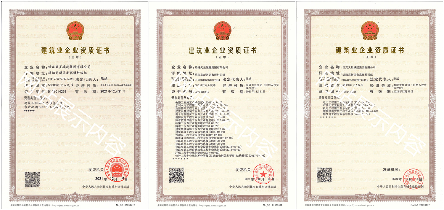 浩龍?zhí)煨浅墙瘓F有限公司,2007年成立于“李白故鄉(xiāng)、中國科技城”—四川省綿陽市,企業(yè)注冊資本金5.0008億元。公司共有27項建筑業(yè)企業(yè)資質(zhì),其中國家一級資質(zhì)11項,二級資質(zhì)10項,三級資質(zhì)5項,特種資質(zhì)不分等級1項,類別涵蓋建筑、市政、水利、機電、隧道、起重設備安裝等基礎及未來發(fā)展重點專業(yè)。公司下設三個辦事處,業(yè)務范圍輻射全國,在建項目三十余個,累計完成產(chǎn)值超11億元。公司是綿陽市建筑施工企業(yè)協(xié)會副會長單位、綿陽遂寧商會會長級單位、綿陽首批建筑業(yè)綠卡企業(yè),在綿陽本地企業(yè)中綜合實力名列前茅。